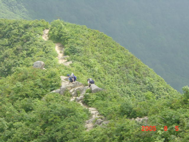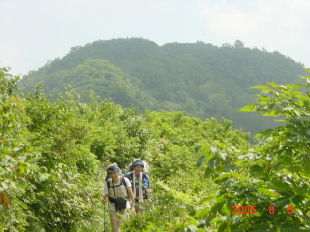 | 内容 | 朝日が顔を出す前の、ひんやりとした空気の中、急な登りを歩き始めました。飯豊の特徴で、稜線までのアプローチがどこから入っても急なのです。高度計にたまに目をやると、いつの間にか30m、50mと、どんどん高度を稼いでいきます。 朝日が顔をのぞかせたと思ったら、あっというまにじりじりとしてきた。さすが、8月の太陽は容赦なく私の肌を焼いていくのでした。それにしても暑い。山よりも、暑さとの闘いで、水がどんどん減っていきました。 最初の水場、とても冷たい湧き水が体中を駆け巡り、少しばててきた心と体を生き返らせてくれました。ここで小休止と朝ごはんのおにぎりを補給。2つはのどを通らず、1つにして冷たい水をなるべく多く補給したのです。 出発する頃には、太陽がまた上へと上がっていて、脳天を直撃するようになってきました。相変わらず、スズメバチが偵察を続けており、とても不気味なのです。時折振り払いながら、頭に白いタオルをのせながらかわしていきます。初日は、黒い上下だったので、余計に蜂に追われているようでした。体系といい、身なりといい、まるで熊そっくりだったんだろーなー。 横峰の合流地点から次第に稜線を歩くようになると、少しずつそよそよと弱弱しい風が吹くようになり、体が楽になってきた。しばらく歩くと、2箇所目の水場、地蔵小屋跡の周辺に到着。ここもで来ると、さすがにおなかが空いてきたので、さっきの残りのおにぎりをいっきに食べて、水も一気に1Lほど飲んで、また元気になってくるのでした。しゃくなげ荘のおにぎりも程よい塩加減とおいしいごはんでとてもおいしかったなー。梅の酢漬けがまた、すっぱしょっぱくて、暑い中でもごはんがどんどん入るのです。 平沢さんが、前日の下見のせいなのか、少しペースダウンしてきたのに対し、毛利さんは去年の朝日連邦の時とは別人のようなペースで先頭を切っていました。 ここらへんで、私も少し自分のペースで歩かないと、逆にばててくるので、最後尾(といっても3人なんだけど…)から先頭を歩くことにしたのです。 水場から、急ながけを登って、血の池あたりの合流点まで来たので、二人を待っていると、なんと、10分も差がついていた!これは、切合小屋を越えて、飯豊本山まで行ってしまおうと考えていたのに、少しあやしいペースになってきたなと、まるで穂高のザイテングラードのような、剣が峰を眺めながら不安になってくるのでした。(TT) つづく |
