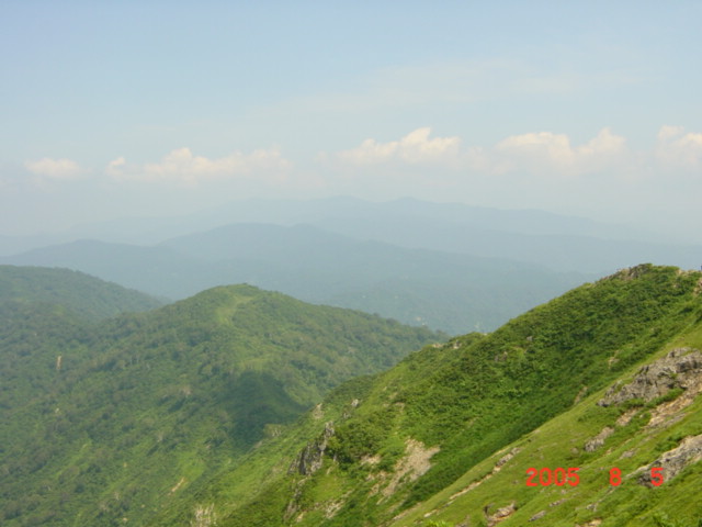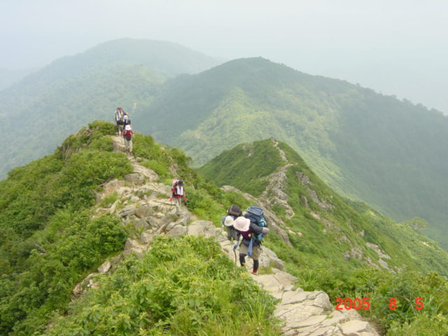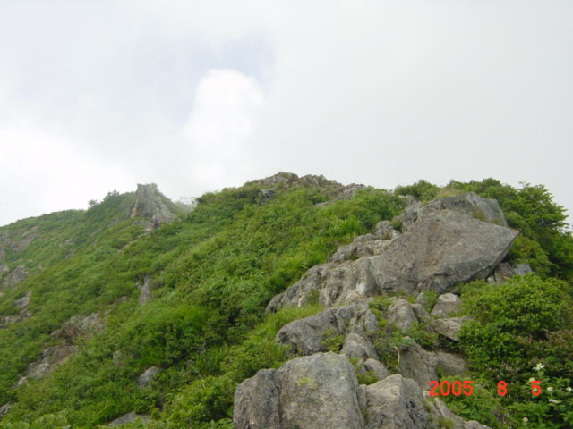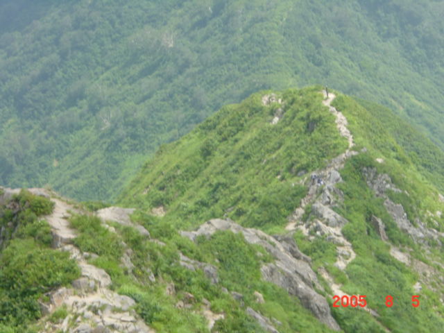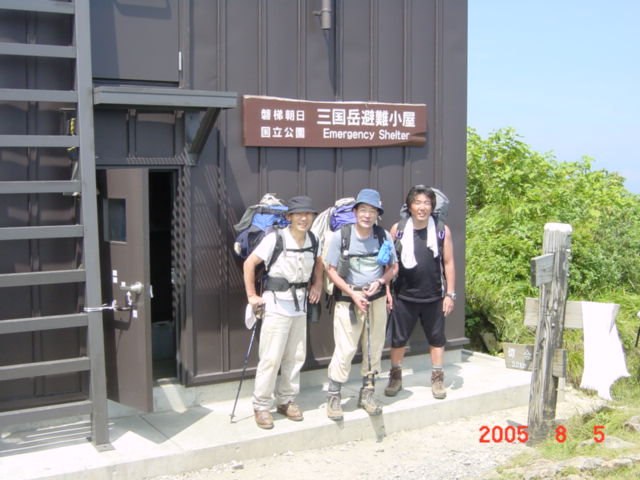 | 内容 | 剣が峰を登り始めると、はるか下方の雪渓からだろうか、涼しい風が吹くようになってきた。森の中をあえぎながら登ってきたのを思うと、とても快適なのである。それに、久しぶりのちょっとした岩場が楽しいのだ。 しばらく登ると、2人がずいぶん離れていることに気がついた。最初は待ちながら写真を撮っていたのだけど、どんどん離れるので、マイペースで登り始めた。三国岳頂上付近まで来ると、ずいぶんと離れてしまい、望遠にしても、私の4年前にエジプトへ行くときに徒町で買ったソニーサイバーショットでは、とても拡大が間に合わないのである。 標高1644mの三国岳に着くと、頂上はずいぶんと人が多かった。しばらく待つことになるだろうと思い、本を読み始めると、小屋の主人が「こんな山の上で読書なんて贅沢だなー」と言いながら通り過ぎていった。相変わらず30キロ以上の荷物には、こんな物も入っているのです。 20〜30分くらい待っただろうか、毛利・平沢組が到着。ものすごい汗・・・。平沢さんがかなりばてているように見えた。お昼に持たされたおにぎりを食べ、(今度は2個一気食い)まだ休憩しているようなので、とりあえず水を汲みに行ってみた。 小屋から来たルートを戻り、左に「水」というマークのとおりに崖を下降していくと、ちょろちょろと、かわいい水場が待っていた。それにしても急な水場で、リュックをしょっていれば、きついだろうなー、などと考えながら、ゆっくりと水を汲んだ。 戻りがなかなかで、レキと砂質の斜面を登るのだけど、岩場と違いずるずるとなかなか登るのが大変なのである。上の方で、女性が「水場は遠いのですか?」と聞くので、「いやー、急だから危険です」というと、「あっそ。じゃあいいや。」と、あっさりと下って行ってしまった。登りで水が無いのは大変だけど、下りだから少しあれば大丈夫だろうし、地蔵小屋跡の水場も下りなら30分くらいだろうしね。そういえば、前に浄土平から西吾妻まで縦走したとき、名月荘に着いたら、関西のおば様達の団体が居て、「水場へ行きますが、誰か必要な方いますか?」と言ったら、「はい」「はい」「はい」とみんなから水筒を渡され、残雪の中を水場まで下り、帰りに重いリュックを背負って戻ったのを思い出してしまった。命にかかわれば助けるけど、下りだったからね。そんなにお人よしではないのだ。 小屋へ戻ると、なんだか足の付け根がヒリヒリするのに気がついた。おかしい。何だろう?トイレで見てみると、何やら擦れて赤くなっていた。もしやこれは、出発前にユニクロで「おおー!!これは素晴らしいじゃないか!!」と、感動してアドレナリンが頭に充満してしまい、クールビズパンツにTシャツ、タンクトップ、などなど、ユニクロなのに20,000円も衝動買いしてしまった、あの感動のクールビズパンツにやられてしまったのである。あんなに、感動して買ったのに、これは間違いなく、クールビズパンツの裏切りなのである。恩を仇で返すというやつか!? こうなると、やはりのんびりはしていられないので、小屋の主人に写真を撮ってもらい、別れを告げると、股ズレの足をぎこちなくガニマタに開きながら稜線の縦走ルートへ入っていくのであった。(T_T) |