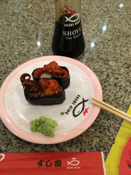海外に来て回転寿しに入った事が無かったので、1度くらい行ってみたいと思い入ってみた。すし金。基本生が無く、固ーくゆでたタコを甘ーく、辛ーく煮た謎の一品や