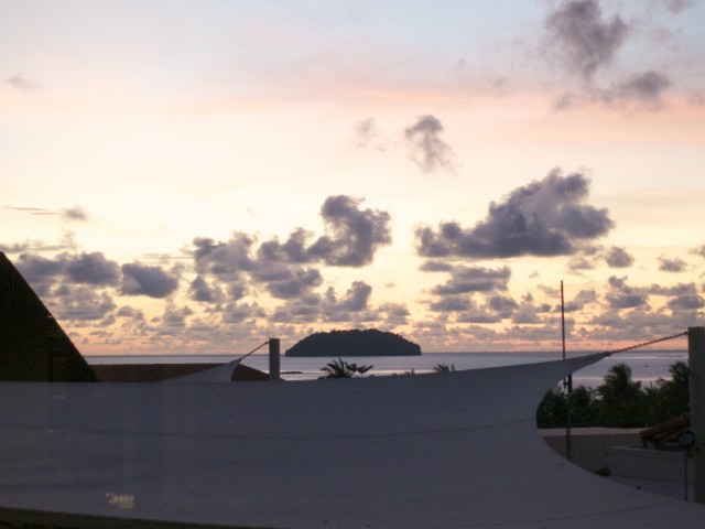 4月2日の朝を迎える。今日は南国らしい雲が凪の海面に映っていた。