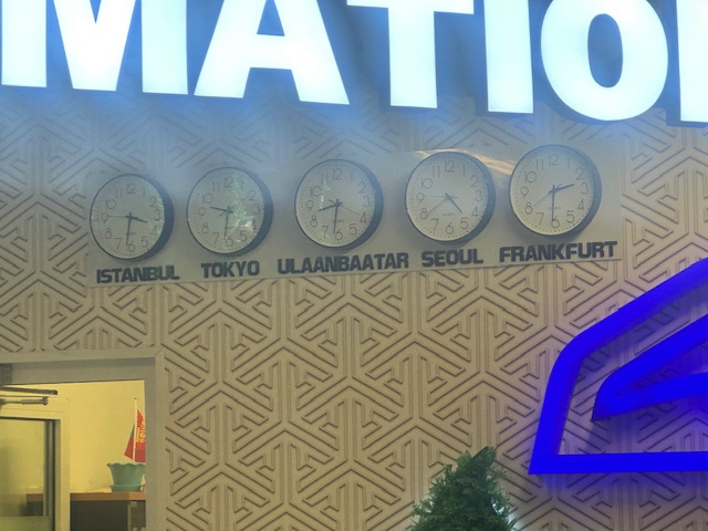 各国の時計がある。日本のほかドイツのルフトハンザも直行便を飛ばしているようだった。