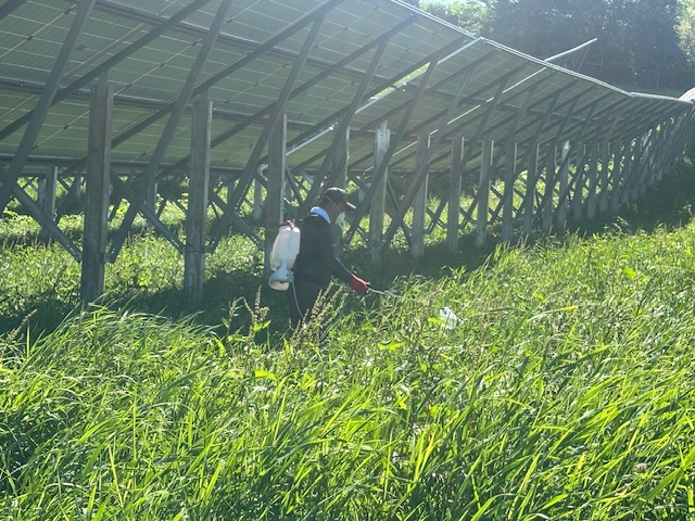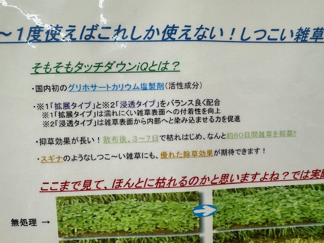 牧草地にイタドリが大量発生してしまい(フェンスの外からこちらへ越境してきた感じ)それを食い止めるために除草剤を撒かなくてはならなくなった。