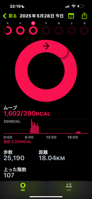 この日は歩数が25,000歩を越え、1600キロカロリー以上消費していた。食べたものが食べなかった事になるレベル^^