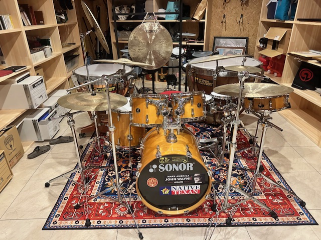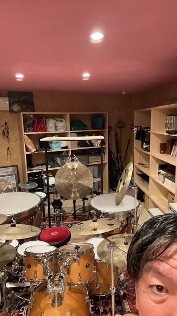 ソナーのスネアが1発余っていたので、ハイハットの隣に配置してみた。2バス(バスドラム)3スネア(スネアドラム)。この頃、音が足りなくてドラマーのしんちゃんにフロアタムを2発お願いしていたので、もう少し増える。スネアはもう30年以上2ヤマハのスネアを使っている。もう今では販売されていない。
