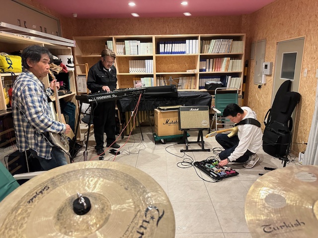 左の2名は元プロ。高校の先輩。柳沼先輩はギターの神童と呼ばれプロになったんだけど、一緒にブラバンでパーカッションをやっていた。現在ベースを弾いてもらっているけどビートというか、ノリが合うんだな。最強のリズムコンビ。岡崎さんも高校の時から(柳沼先輩と一緒に)バンドを組んでいたんだけど、卒業してから29歳で再会し、そこからずっと一緒に演奏しているので、社会人バンドを組んでからもう30年も一緒に演奏してきた。ギターの大橋くんともその頃に出会って、少しずつ一緒に演奏するようになり、随分と長い付き合いになった。リッチーブラックモアを愛するプロ級のアマチュア。