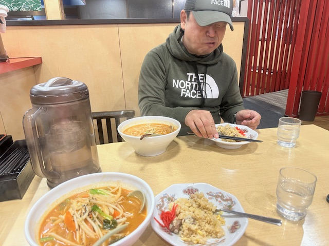 途中の浜ちゃんぽんに寄り、いつもの辛味噌ラーメンと明日昼まで食事は多分抜きになるのでチャーハンを頼み半分ずっこした。