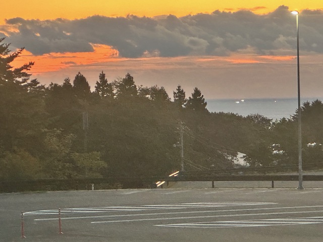 美しい夕景を見ながら7号線を北上。飛島が見えていた。