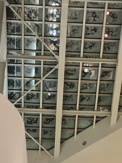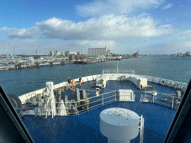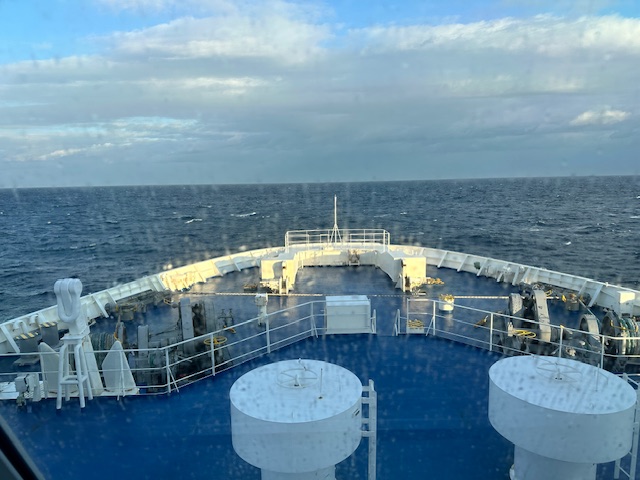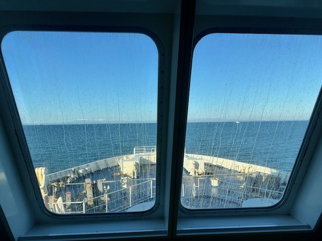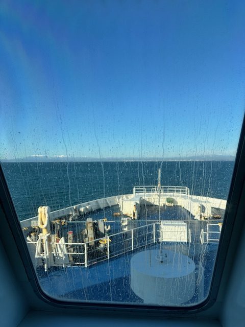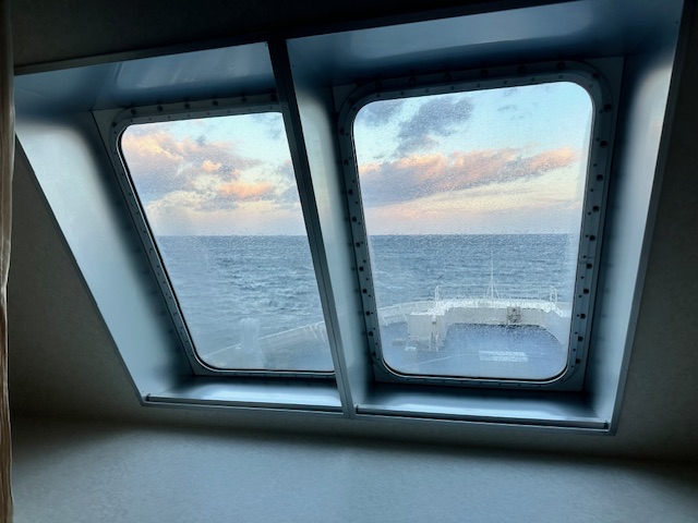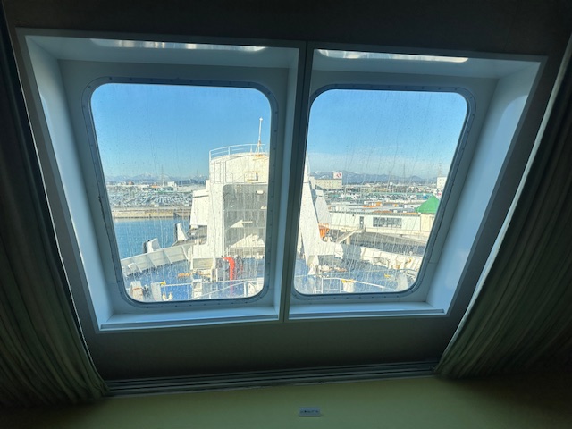 翌朝。おはようございます。夜中に船底が「ドカンドカン」と言っていたので海はそれなりに荒れていたみたいで、窓ガラスには塩がこびりついていた。