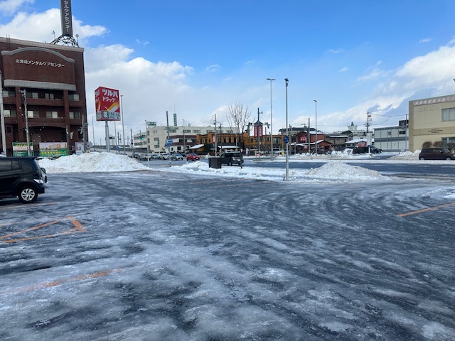 苫小牧は雪の後雨が降ったそうでガチガチに凍っていた。
