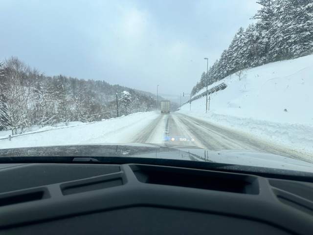 道路にも積もり始めて、凍っている時よりも安心。アスファルトのように曲がります。