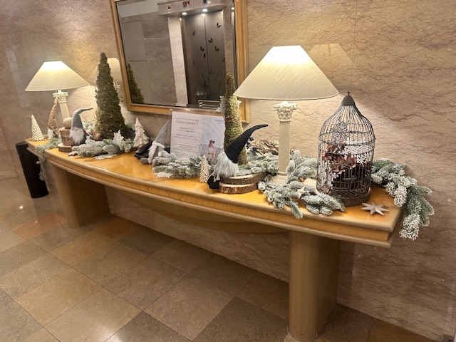 エレベーターの前。冬の装い。