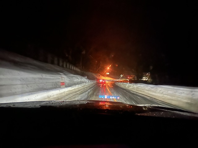 帰り道の小國峠。ここは日本有数の豪雪地帯だけあって北海道並みに雪の壁ができていた。2月11日。ちょうど1週間ぶりで地元に戻った。案外早くて21時頃には戻れた。今回の旅は随分と長い間旅しているような気分だった。