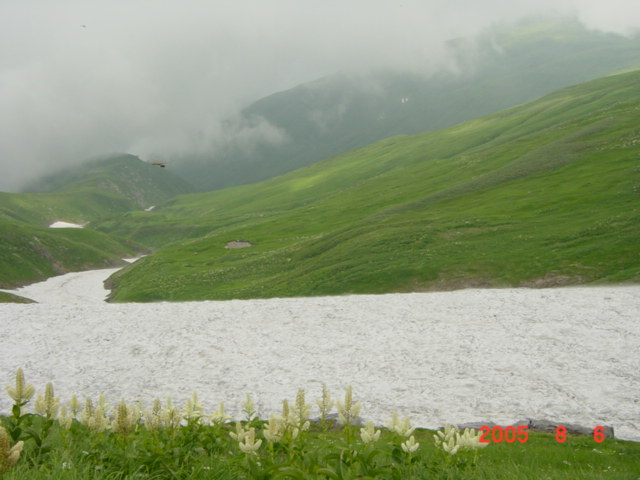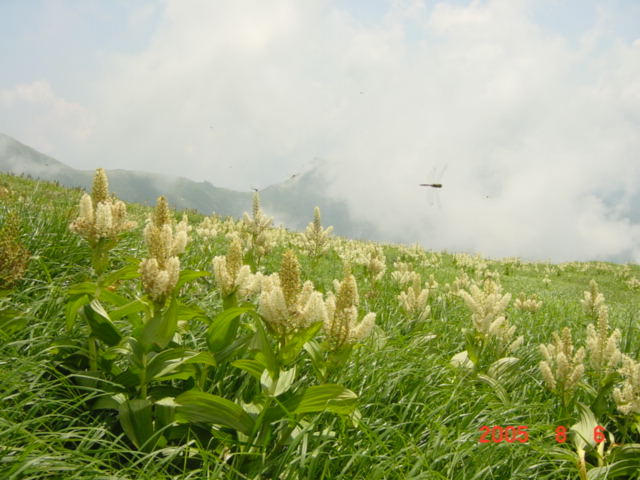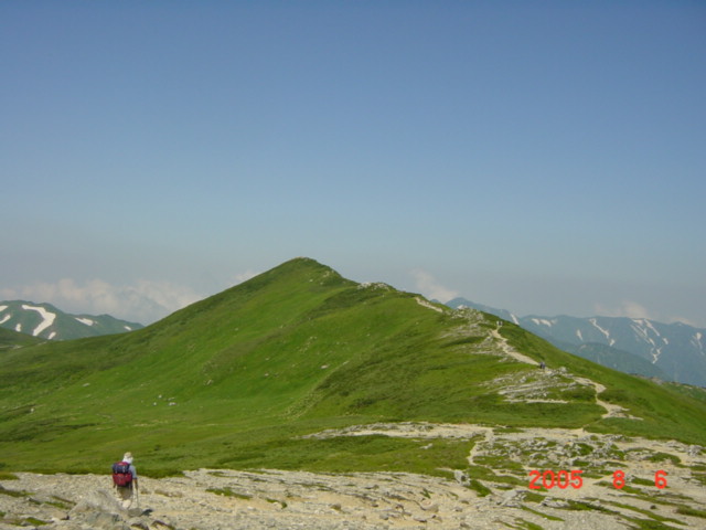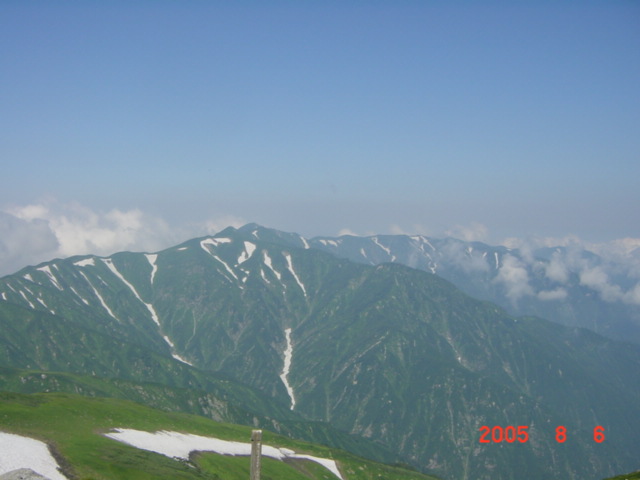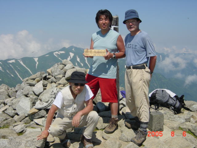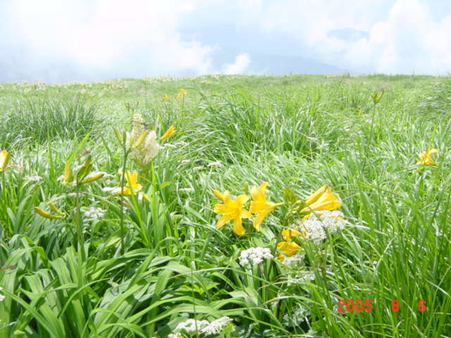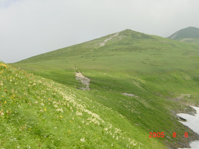 | 内容 | 飯豊神社を後にして、飯豊本山を目指す。ここは、「稜線のお散歩」といった感じなのだけど、先が長いので、あまりのんびりも出来ない。花梅皮小屋(カイラギ小屋)までの山並みを見ると、気が遠くなるくらい遠くに見える。本当にあそこまで行くの?と、誰かに確かめたくなる。右にダイクラ尾根へのルートを見ながら、15分ほど歩くと、飯豊本山へ到着。 標高2105mの絶景が待っていた。「ここにずっと居たいなー」と、またいつものように考えていた。そういえば、5年ほど前、天気が良いので安達太良に登り、昼過ぎから夕方5時くらいまで頂上で水割りを飲んでいたら、元ギャルに「あら、仙人がいたかと思った」と言われたことがあったけ。あの時も同じく帰りたくなかったなー。だんだん夕焼けになってきて、綺麗だったのを覚えている。っていうか、5年前は仙人と間違われるくらい痩せていたのかなー。えーんえーん(T∧T)なーんちゃって。 本山の頂上で、親子4人連れと出会い、写真を撮りあった。一番下の男の子が、「もう戻ろうよー」と、お父さんに言っていた。先を急がなければならないので、10分くらいで御西岳を目指してスタートした。 平沢さんが遅れていたので、何とか先行してペースを上げさせようと試みたけれど、相変わらずどんどん離れてしまう。少し待ちながら歩くと、さっきの親子に抜かれてしまう。それでも、追いついてこないので、少々焦り出した。 駒形山の頂上に着くと、さっきの男の子が、「お父さんもう戻ろうよー」と言い出し、いよいよお別れの時がきたみたい。お父さんに、「後ろにいる連れへ御西の小屋で待っていると伝えて欲しい」とお願いをし、昼食の準備もあるので、毛利さんと先を急いだ。 それにしてもここはコバイケイソウの花畑だ。それにニッコウキスゲもたくさん咲いている。他にも小さな花々がたくさん咲いて、花も短い夏を楽しんでいるようだった。 コクドの佐藤浩哉さんから教えてもらったのだけど、コバイケイソウは毒草なのだそうで、食べると死に至る怖ーい花なのである。綺麗な花から、根っこの先までが全てだということで、ボヤボヤーとした外観とは違って、中には毒をたたえているという、恐るべき相手なのである。 雪渓からの涼しい風を浴びながら、花を楽しみながら、写真を撮りながら歩いていく。 次第にあたりが曇ってきた。いつの間にかギラギラの日差しが顔を引っ込めていた。涼しくて歩きやすい。もう、下界へ降りるような気持ちにはなれないのであった。 しばらく行くと、何やら工事をしているような音が聞こえてきた。お昼前に御西小屋へ到着。立派なトイレを作っている最中らしい。こちらも、それほど大規模ではないけれど、お昼ご飯を作らなければならない。お湯を沸かして、今日はカレーうどんなのである。今度は、朝のような失敗がないように、適量のわかめとねぎを入れて作る。 わかめを見るたびに思い出すのが、コクドの元上司軽部親分の話。本四公団の連絡橋を作る現場に居たとき、熊谷・国土・若築JVだったらしいのだけど、現場代理人全員がゲーハ−で、週に一度ダイバーが取ってきてくれたわかめを食べる「わかめ会」というのがあったらしい。わかめがゲーハーに効いたのかどうかは、内緒。(^^) カレーうどんを食べて、コーヒーを飲み終わったのに、待っても待っても平沢さんが来ない。かれこれ、到着してから1時間以上過ぎている。まずい。毛利さんと話し合ったけど、このままのペースだと、花梅皮小屋到着が夜7時〜8時になってしまう。そんなになってしまえば、テントも張れないし、夕食の準備だってできない。今回の旅最大のピンチなのである。股ズレ以上にピンチなのである!!相談の結果、先に幕営地まで行き、準備をするしかないという意見で合致した。 平沢さんが、やっと到着し、「かくかくしかじかである」と伝えると、「えー?そーおー?そんなにかかんないでしょう?大丈夫だろう?」と、気の抜けてしまうような返事が返ってきた。「とにかく、先に行って準備をしないと今夜は食事も寝ることも出来ない」といい、「平沢さんの上に乗っている重そうなの俺が代わりに背負うから」と、荷物を手にすると、「あ、そーお?悪いねー。」と手渡され、自分のリュックの上のところへ乗せ、はさんだ。今回は、32キロくらいの荷物だったけど、減ったのがワイン2Lくらいなので、水が増えたぶん、まだ30キロは切っていないように思われた。預かった荷物が、2〜3キロか、3〜4キロか、まあ、仕方が無いのである。上を向いても頭がリュックにつかえて高いところが見えない。頂上がわからないから、下を向いて歩くしかなく、「あれれ?いつの間にか頂上に着いていたよ!」的な、心がつらくならない山登りが出来そうであった。 「この先は、迷うようなところは無いだろうけど、大丈夫?なるべく急いでください」と言い残し、心配な気持ちと心配な空を抱えながら、背中にはさら