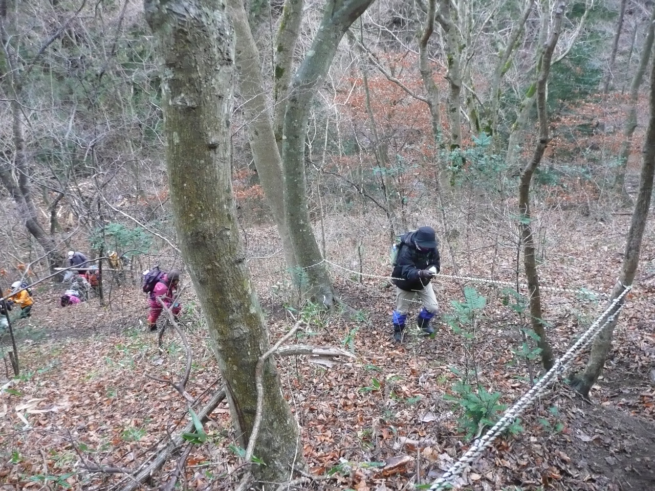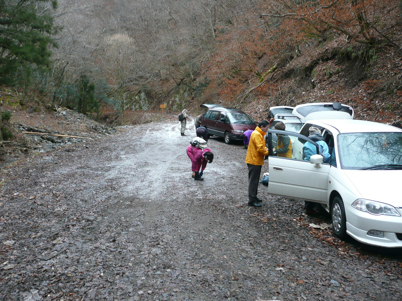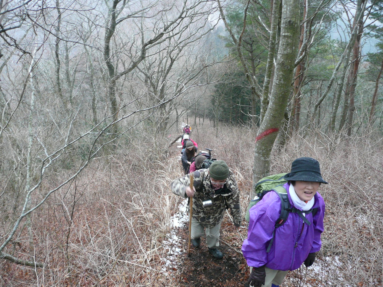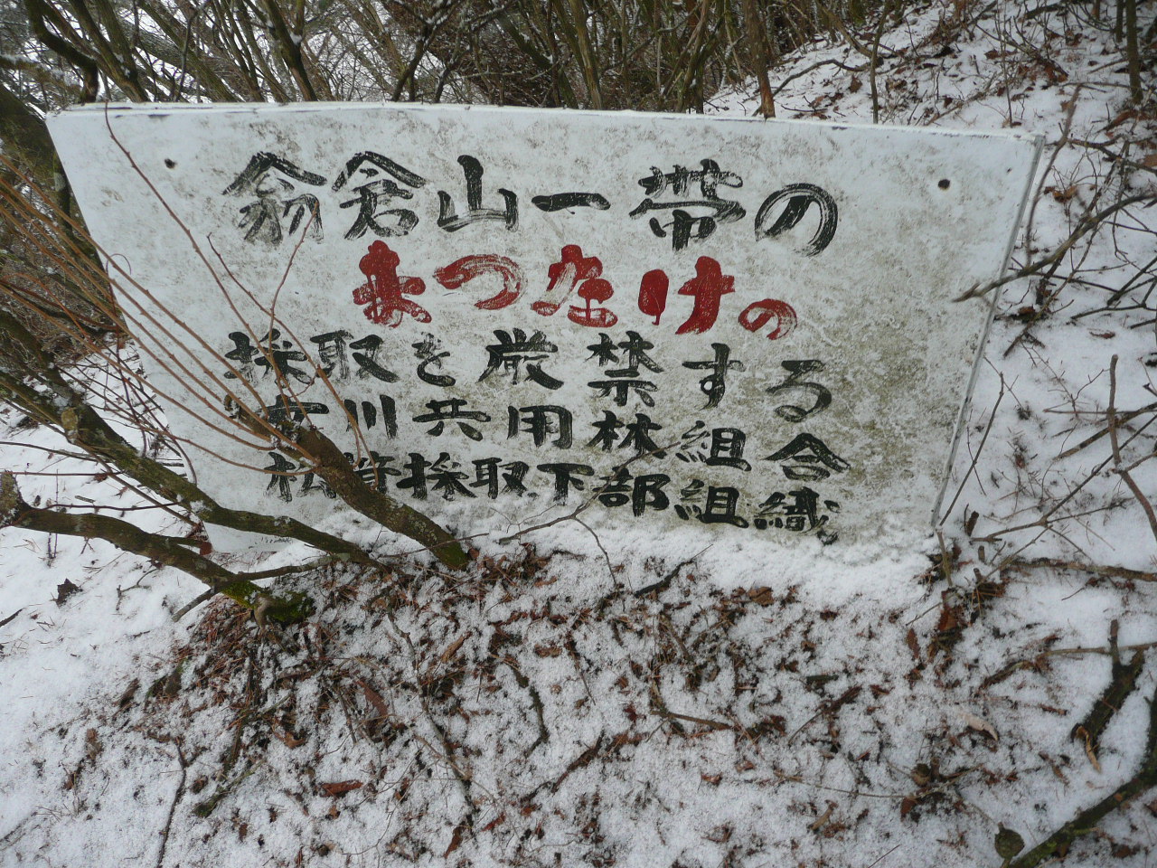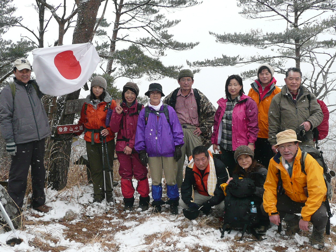 | 内容 | 翁倉山である!! 5324mもあった!!日本一かっ!? というわけで、遊山会2010年最初の山は、宮城県北部、石巻市(旧北上町)にある山でした。 宮城インター集合で、仙台南部道路〜東部道路〜三陸道へと進んで行きました。 佐藤浩哉さんの故郷、旧河北町を過ぎ、日本の音風景100選のヨシ原がある北上川沿いに進みながら、登山口へ向かうのでした。 登山口の手前が、工事中で通行止めだったけれど、毛利さんが交渉して、工事車両をどかしてもらい、一時的に通してもらう事が出来たのです。(さすが建設業界の重鎮) 登山口に着くと、夜に降ったのか、雪が残っているのに、小雨がぱらついていて、さすがに冬に半袖短パンは友達を無くしそうだったから、久しぶりでフリースと夏用の長ズボンを履いてきたのだけど、(勿論中はTシャツ1枚で)念のため、カッパを上だけ着てスタートしました。 先頭を2分も歩くと、左側にロープが見え、いきなりの急登。久々にアドレナリンが噴出した私は、ロープを引きながら、ぐんぐんと高度を稼いでいったのです。しばらくすると、「須藤さーん!!早すぎるー!!」と、TONTON(商売がトントン拍子にいくという願いのこもった店名。ホントにトントン拍子みたいでいつも混んでいます)のママから言われ、やっと噴出がおさまり、スローダウン。 そのあとは、緩やかな登りだったので、あまり休む事もなく少し早目のペースで進んでいった。 なにやら、後方の話に耳を傾けていると、松崎さんが最近お寺で座禅を組んでいるらしく、TONTONのママに「素晴らしい」と褒められていた。 そのうちに、何やら念仏が聞こえてきた。「般若信教」らしい。 そーいえば、去年のいも煮会登山の時にも、たまたまお寺の敷地に入ってしまい、ママが念仏を唱えていたのを思い出した。山で念仏。合うような、合わないような・・・ 俺の耳に念仏。合わないなー・・・ あの時と同じ音色。TONTONのママだった。 (TONTONのママは、普段は勿論、山でも声が必ず80ホンを超えているので、きっと念仏は山にコダマしていたと思います。マスターと私はその前方で終始無言でした。) そーいえば、久しぶりで、谷さん、佐藤さんらが来てくれた。なかなか、仕事が忙しかったようで、谷さんなんかは仕事を辞めてしまったらしい。山のためにはそれで、いいのだ。 しばらく歩き、右折。稜線に出たけれど、眺めが全然良くない。それに、稜線には雪が積もってきた。滑って歩きずらい。1歩進むのに、ずるっと滑るから、半歩くらいしか進まない。まるで365歩のマーチだな。 なかなか手ごわい登りで、結構急だった。冬場は寒いのでトレーニングを休んでいたのだけれど、その影響がもろに出ていた。雪がでかい顔に当たり痛いので、ほっかむりをしていたら、毛利母に笑われてしまった。(かなり似合っていたと思います) 偽ピークが続き、登っては下り、登っては下りをしていたので、だんだん性格が悪くなってきそうだった。「もうすぐ頂上かっ!?」「また違うーー」期待はあまりするものではない。 「松茸採取禁止」みたいな看板があり、よっぽど取れるんだろうな〜と、素人の私にも分かってしまう。もっと上手な告知の仕方は無いのだろうかと、どの山へ行っても思う。「松茸なんかはありません!!」「マムシによる死者年間100人!!危険!!止まらず進め!!」「松茸が良く生えるのは11時の方向に見える高い山の北斜面だと思います」とか、違う看板を考えた方が良いと思う。 いつまでも頂上に到着しないので、松ちゃんがシビレを切らし、「俺が見てくるー」と言った時には、もう駆けだしていた。すごいスピードで駆け下り、また駆け上がったいった。さすが、元自衛隊です。 「頂上ここだー!!」という声が聞こえ、「おー!!」と返事をしながら行くと、祠があり、「翁倉山頂上」という小さな看板があった。天気が良ければ海が見えるような場所なのに、ガスと雪で全然見えない。 「翁倉山山頂」の看板の下に高さが書いてあってよく見ると「5324m」と書いてある。「なにーっ!?日本一かいーっ!?」と、思わず言ってしまったら、みんながけらけら笑っていた。 よく見ると、「532.4m」の「.」が削られており、いたずらなのか、ユーモアのある翁倉山ファンが何とか日本一の山にしようと考えに考えての策だったのか、これは未だに「謎」のままである。 雪で、いつものように頂上でのんびりお昼ご飯という訳にもいかず、各自おにぎりを1つほおばり、今年初の「モーリキューリ」を頂き、人生初の「モーリハハショーガダイコン」も頂き(うまかったなー)すぐに下山開始。 今まで頂上という未来を目指して登っていたのに、そこにに到達すれば、過去と思える登山口を目指すのである。 山に登っていると、楽しい山ほどそうなんだ。 下山途中、やっと遠くに海が見えた。海の方が高く見えたので、こちら側にこぼれてきそうだった。 浩哉さんのお母さんのお友達の経営している宿、「追分温泉」で汗を流した。古い学