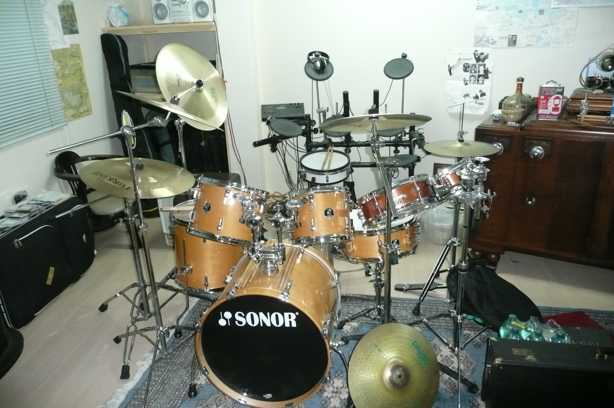| 内容 | こんばんは。 いよいよ暑くなってきましたね。 今日は、会津の東栄町パーキングへ行き、現地で島田社長、須貝看板の須貝さんと打ち合わせをしてきました。 帰りにタラの芽を発見し、袋に1つ採れたので、島田社長のお土産にしました。 事務所に戻ると、我妻社長から筍が届いており、さっき茹でたところです。明日、筍と鶏肉と糸こんにゃくの味噌炒めを作ります。(私の春の定番料理です。) さて、我が杉本ビルの地下にあるライブハウスC−Moonの店長より、「6月13日日曜日にロック対ジャズ対ブルース決闘ライブがあるんだけど、出ませんか?」とのお誘いがあり、いつものメンバーと打ち合わせをしたところ、ギターのりおちゃん、キーボード岡崎先輩、ベースの大くまねこギタークラブさん、ドラム私の4人でインストルメンタルなハードロック中心に演奏するバンドを結成し、参加することになりました。 曲は、4人でうだうだと、ボソボソと、あれやこれやと、何となく決めていたのだけど、ライブの予定が無かったので私は一度も聞いていなかったので、全く覚えていないのに、あさって20日木曜日に音合わせをする事になりました。 さすがに本番が決まると少し焦ってきたので、事務所でエレドラを使って個人練習を始めたところです。 初めて聞く、しかも構成の複雑な、リズムも変拍子、裏拍といった面倒な曲ばかりで、しかもツーバスまであり、ワンバス(バスドラムが2発か1発かという違いです)を27年間貫いてきた私は、ワンバスでツーバスを叩くという荒行を思いついたわけで、ただいま足が完全にわらております。 まあ、なんとかテキト―にこの難局を乗り越えて、我がドラム力となるよう頑張りますので、6月13日日曜日、時間のある方、福島市大町4−24杉本ビル地下C−Moonへお越しください。 なお、時間は夕方からと記憶していますが、詳しい入り、開始時刻等解りましたら再度ご連絡いたします。(だんだんFAX送信案内みたいになってきたので、これでおしまい) |