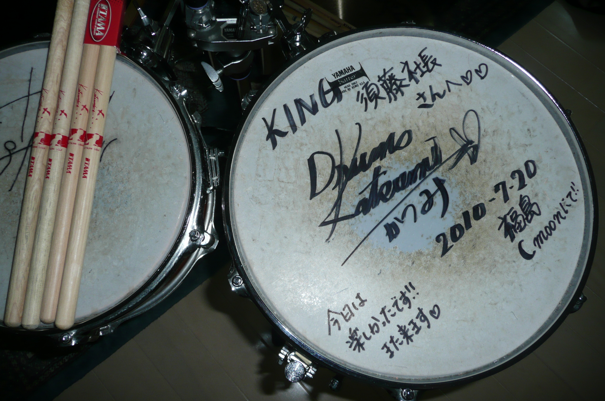 | 内容 | こんばんは。 昨日、森園勝敏さんのばんど、S−Four feat の前座を無事終えました。 演奏は、いきなり外したり、曲の終りの直前にスティック飛ばしたり、いろいろありましたけれど、まあ、楽しめました。反応も良かったようです。 プロの皆さんの演奏を、自分の演奏終了後に見ていたのですが、ドラムの臼井かつみさん ( http://katsumi-chang.com/ )の演奏が素晴らしく、女性で、小さな体なのに、ものすごくパワフルなドラミングに感動してしまいました。 演奏終了後、懇親会があり、ivi楽器社長天才ドラマーシンちゃんと、かつみさんと、私で同じテーブルで盛り上がって参りました。 Tシャツや、CDを売っていたので、Tシャツ3枚とCD1枚を購入。 お礼にという事で、私のスネアドラムにサインを頂き、写真も一緒にたくさん撮って頂き、さらにドラムメーカーの「TAMA」とスポンサー契約があるらしく、TAMAのかつみオリジナルスティックの、実際にライブで使用した物と、未使用の物2セット頂き、感激してしまいました。 片岡鶴太郎師匠もそうでしたが、本物はやはり威張ったり、横柄になったりしないものです。人柄に引き込まれてしまいます。 臼井かつみさんは、心優しい、小さな巨人という言葉がぴったりのドラマーでした。これまでに数々の大物アーティストと共演しています。これからも楽しみです。 さて、次のライブ予定も立てて行くのですが、久しぶりで野外があり、こちらに参加しようかと考えております。 少し休んで、新しい課題曲を5曲位選んで、8月のライブ出場を目指したいと思います。(覚えられない時は、一部入れ替えの可能性あり) すっかり、ライブのメンバー紹介では、「キングスドウ」と紹介されるようになり、何の「キング」なのか、考えていました。 思いつくのは「借金グ」くらいしかないのですが、今更「何キング?」などとも聞けずに、そのまま紹介されれば、簡単なドラムソロなどを入れて挨拶しています。(ホント、いい加減です。なあなあです。) それで、かつみさんのサインも「キング須藤社長」となっていて、「キング」「須藤」「社長」がいっぺんに書いてあると、何だか「殿さまキングス」を連想してしまうのは私だけでしょうか? どうぞ、これからも音楽続けていきますので、応援してくださいね。 ライブも終わったので、今週末は日本100名山、世界で一番 人が無くなっている山(800人を超えるそうです)谷川岳の頂上を目指します。 |