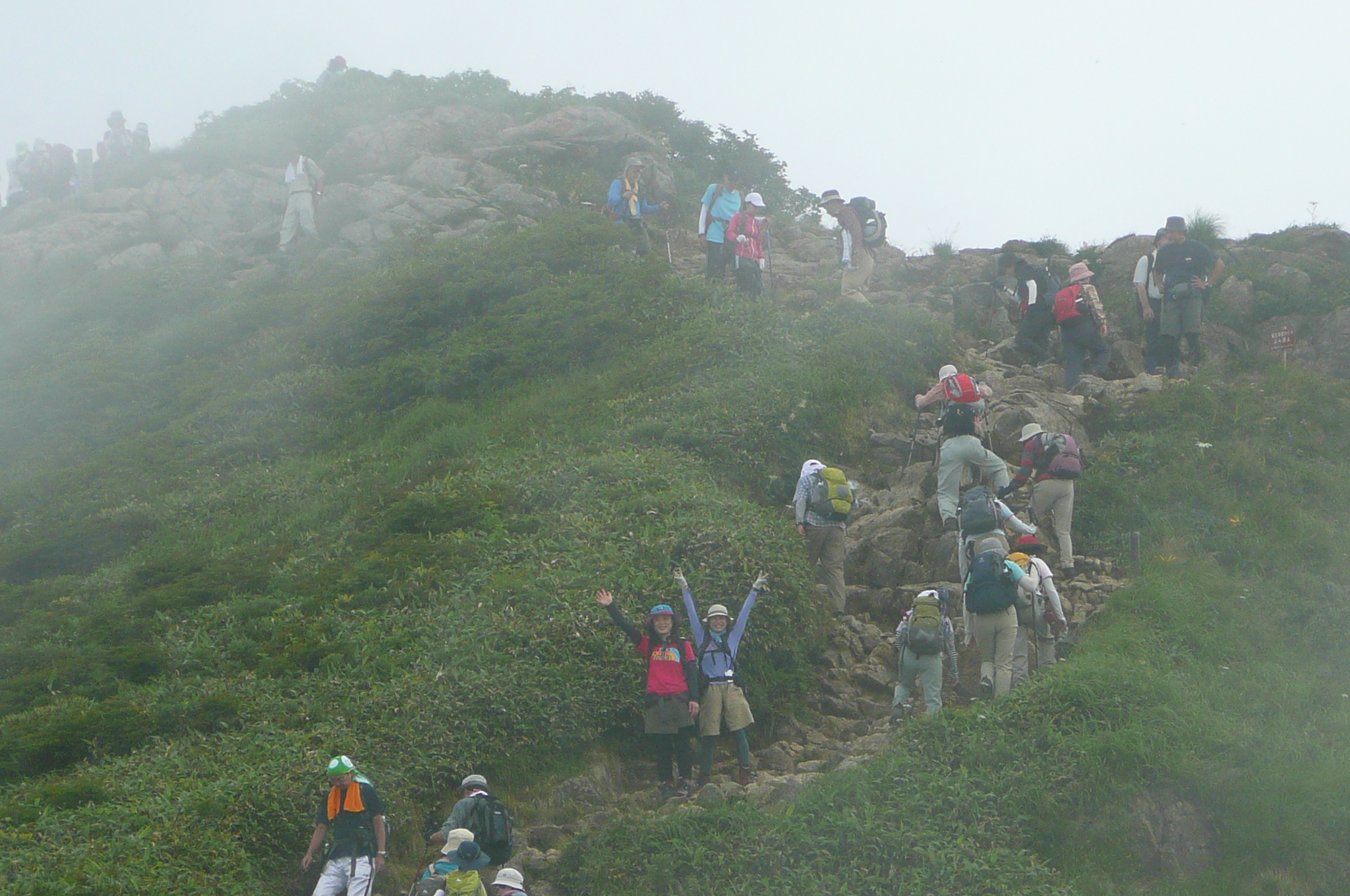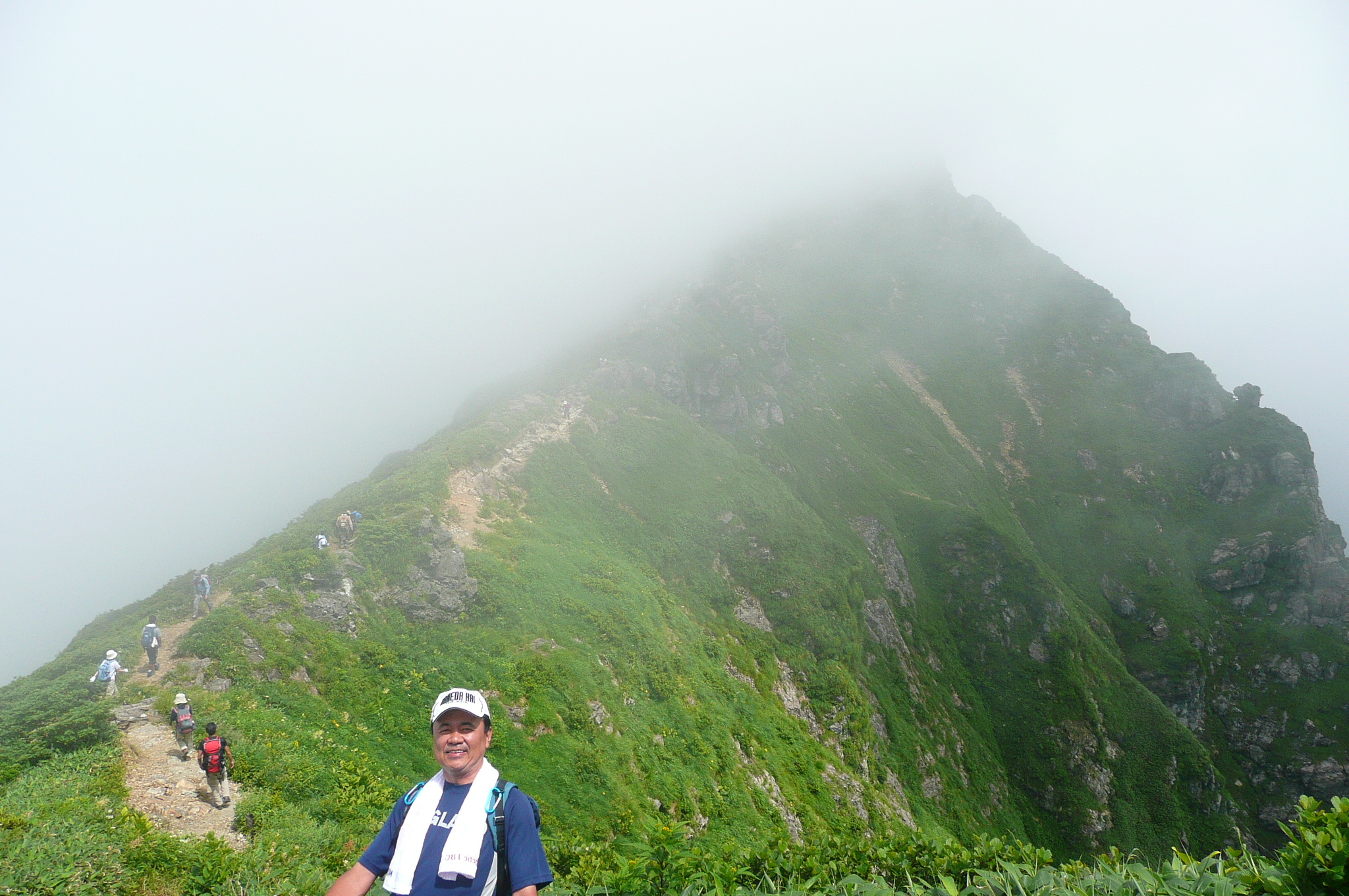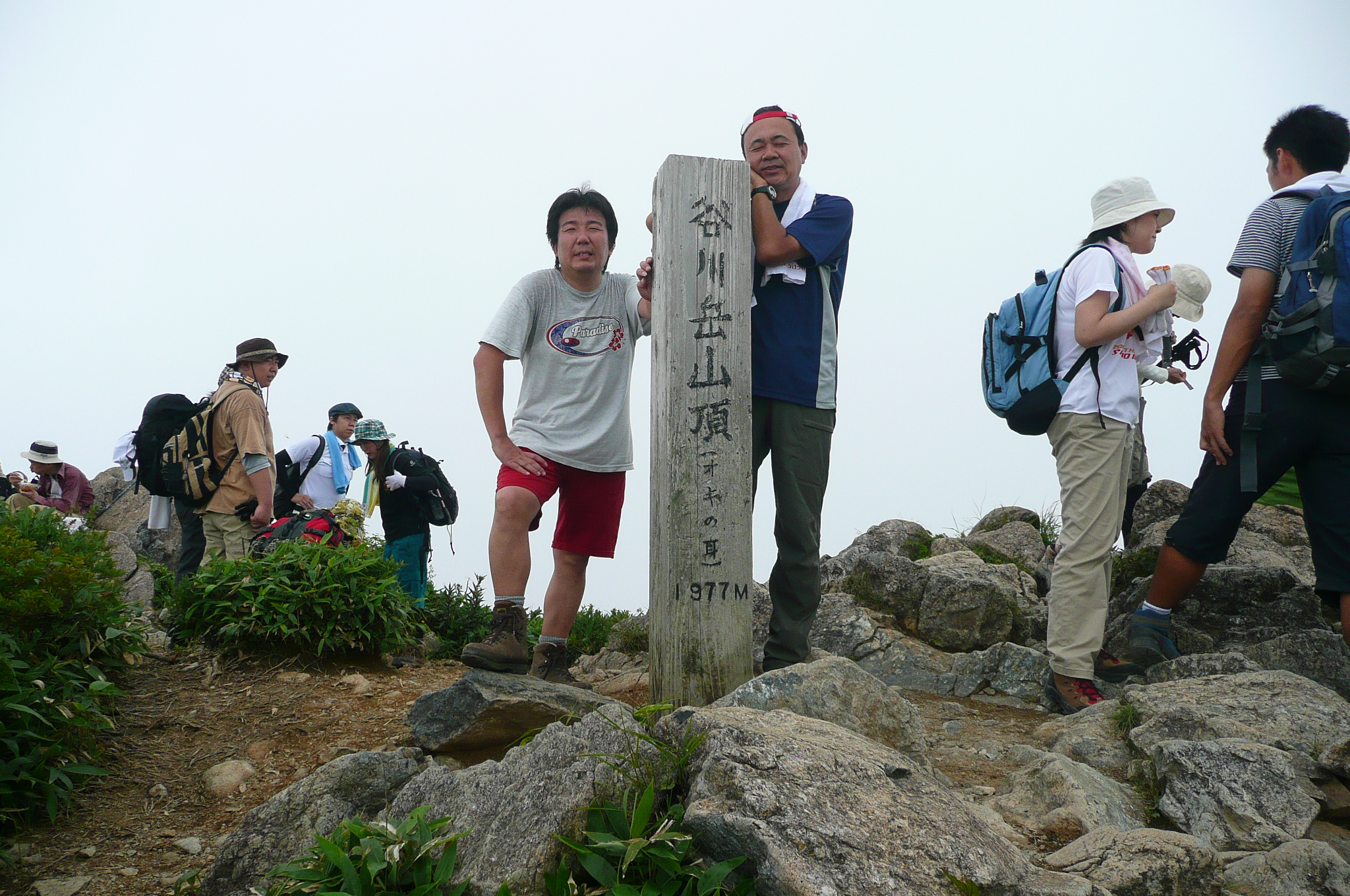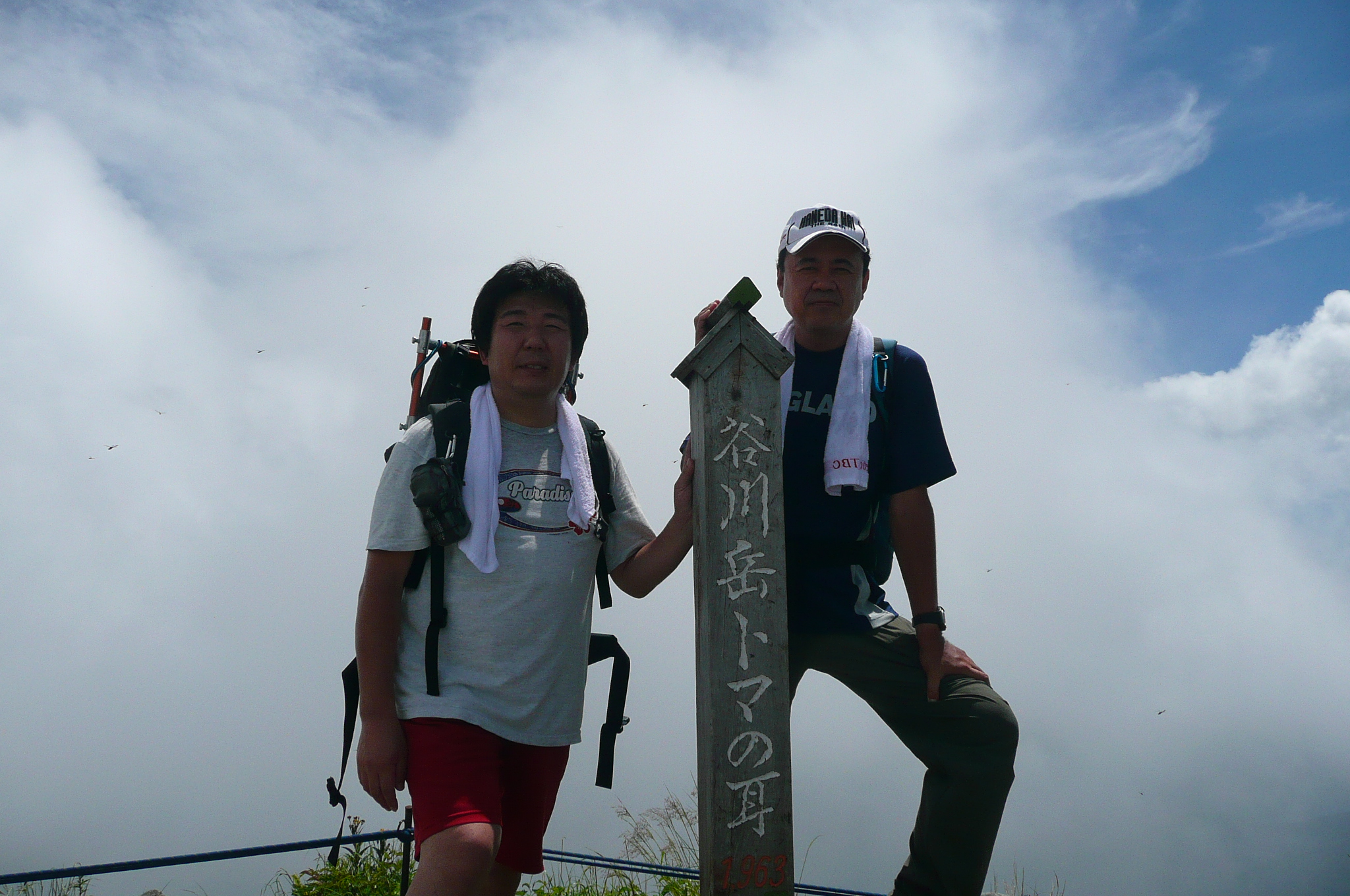 | 内容 | 朝起きると、快晴だった。蒸し暑く、寝苦しいのちょっと手前くらいの夜とは思えないくらい、カラッとしていた。 二日酔いのレベル4(10段階)くらいの状態で、朝食を済ませ、準備を整えてバスに乗り込む。6:30出発。 ロープウエイが7時始発なので、乗り場で少し待つ事になった。 それにしても天気がいい。良すぎて暑そうだった。 ロープウエイの下り場(上がった先)が21度だったので、朝の7時前だというのに、やはり登山には気温が高すぎる。 夏山こそ、高い山を選ぶべきだと私は思っているのだけど、2000mを超えてくるとグッと涼しくなってくる。3000mまで上がれば、朝夕は寒くてフリースやジャンバーを着込まないと居られなくなるし、日中は上り下りしている限り、いつもの半袖短パンがちょうど良い。 ロープウエイに乗り込むと、途中からものすごい斜面を登って行き、この辺りにも登山道があるらしいのだけど、つくづく行かなくて良かったと思った。スタートからこんな急斜面を歩いたら、ものすごい暑さだと思う。(しかし、自分も軟弱になったのか、根性が無くなったのか、情熱の炎が弱火になったのか・・・いままでこんな事は考えたことが無かった) ロープウエイを下り、7:30より登山開始。谷川岳トマの耳〜オキの耳(主峰)〜時間が許せば一ノ倉岳までをピストンしようという行程。 最初は緩やかな、林の中を登り始めた。斜めの木道が歩きづらいし、木道が終わり次の木道に入る時、とても高い位置にあるので、それも「よいしょ」と、歩きづらかった。 しばらく行くと小屋が見えてきた。ここを出発した頃から、蒲原さん(かんちゃん)、遊佐さん、毛利優ちゃん、らが先頭に立った。 自分が先頭を行っていたのだけど、須藤・浩哉いつもの二日酔いコンビはどうでも良くなってきて、「休み休みゆっくりいくべー」が、合言葉であり、励まし合いの言葉となっていった。 アッという間にに森林限界を過ぎ、太陽がジリジリとしてきた。登山道も次第に急になってきて、喉は渇くし、汗は止まらないし、足は前に出ないしと、ダメダメコンビはすぐに休憩をとり、休めばいつまでも出発しないという繰り返しだった。(そーゆー意味では非常に息が合っていた) それでも頂上はグングン近付いてきて、「天神ザンゲ岩」なる場所に到着すると、なんだか大きなダブルベッドか、大きなソファーのような岩が、形は両手をお椀の様にしたような状態というか、大きな貝殻の様な感じで私達を待っており、どちらからともなく「大休止」の言葉が出てきて、二人で寝転がって休んだ。 当然、眠ってしまい、20分くらい過ぎた頃だろうか、佐々木夫妻が到着していて、奥さまに笑われてしまった。 だって、気温、日差し、疲れ具合、絶妙のタイミングにベッドがあれば、寝ない方がおかしいと思うので、みんなの方がおかしいから、これでいいのだ。d(^^)b 登る途中には遠くに至仏山、燧ケ岳、近くに武尊山(ほたかさん)、その奥に皇海山(すかいさん)、男体山、日光白根山が見え隠れしていた。武尊、皇海、男体山は登ったことが無いのだけど、見るからに男体山は大変そうだった。(南会津の山々を上っていると、案外近くに見えるお馴染みの山だけど、なだらかそうな斜面をどの角度からも見たことが無い) 去年の八ヶ岳の小屋まで激走して登った二人組とは思えないような、トボトボヨタヨタゆっくり歩く2人は、それでも1歩1歩進み、頂上直下「肩の小屋」まで到着。 そこからさらに登り、「トマの耳」1963mに到着。なんと、3時間以上もかかってしまった。 相変わらず頂上は混んでいて、順番を待って佐々木さんに写真を撮ってもらい、少し下りてその先の「オキの耳」を目指した。稜線を歩き、右側はさすがに切り立っていて、スリリングだけど、登山道の幅が結構あるので全く問題ない。 「オキの耳」に上る手前で遠くから私を呼ぶ若い女性の声が聞こえ、こんな所にまでファンが追いかけてきたのか、それとも意識が遠のき、先に岩場で遭難した女性達の叫び声がコダマしているのか、などと思っていたら、前方の岩場で手を振って私の名前を呼ぶ若い女性二人がおり、「よくもこんな山の中にまでファンが追いかけてくるものだなー」と思っていたら、毛利優子ちゃんと、遊佐さんだった。(それは手を振る訳で・・・) かんちゃん、TONTONママ、優子ちゃん、遊佐さんとすれ違いで聞いてみると、「時間が無く、一ノ倉岳までは全員行けなかった。富士浅間神社奥の院でお参りをして戻ってきた」 という事で、昼寝したり、休んでばかりいた私達ダメダメコンビと、たいして変わらないじゃないかと思い、そんなに急いでもそれほど変りはないものだと、自分達を慰めながら、「オキの耳」頂上へと、ちゃんとたどり着くのでありました。 こちらも混んでいて、少しガスがかかったり、晴れたりの繰り返しで、とりあえず写真を撮り、来た道をまたトボトボと戻る、従走とは違い帰り道が少しさみしい、