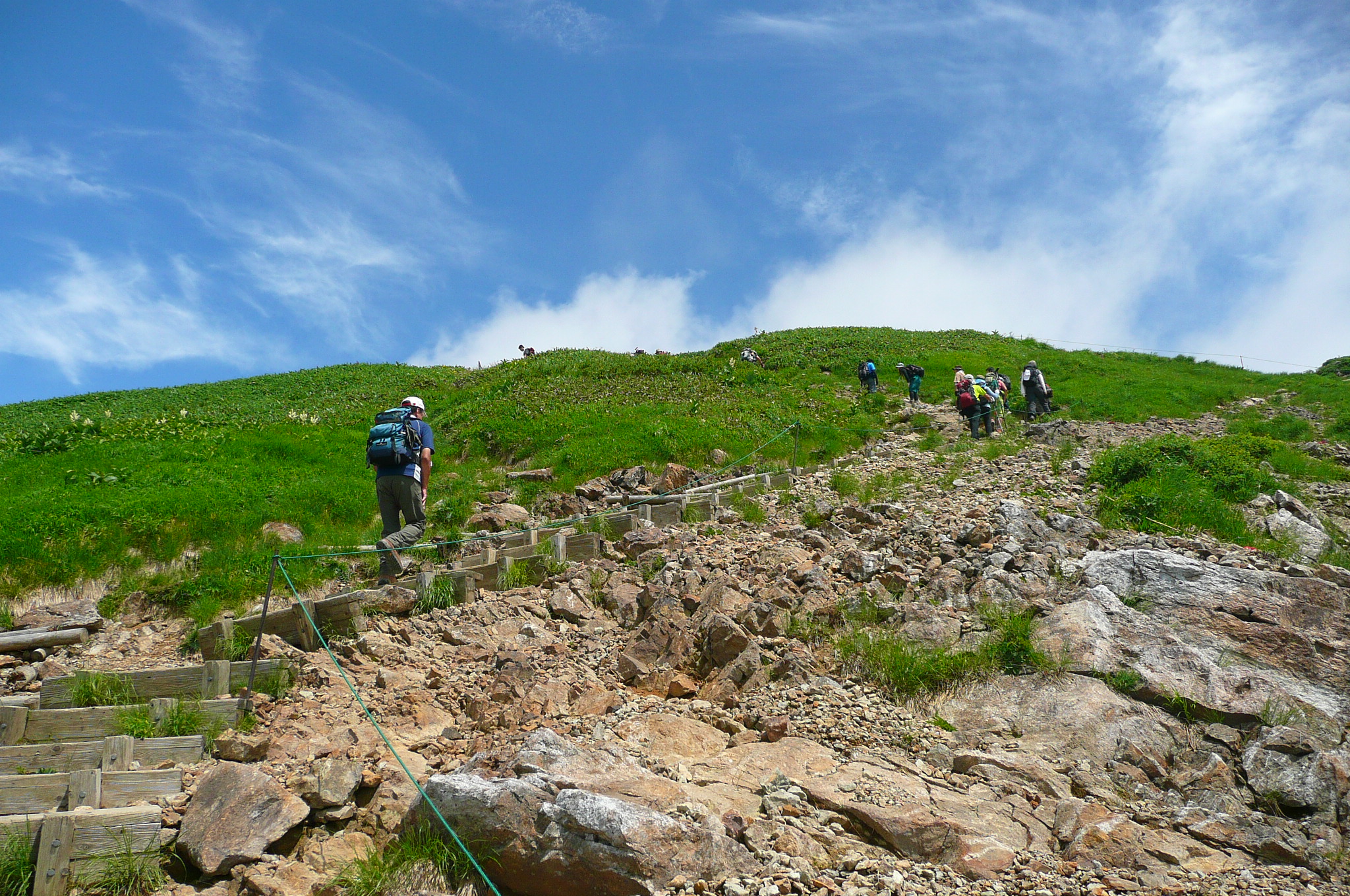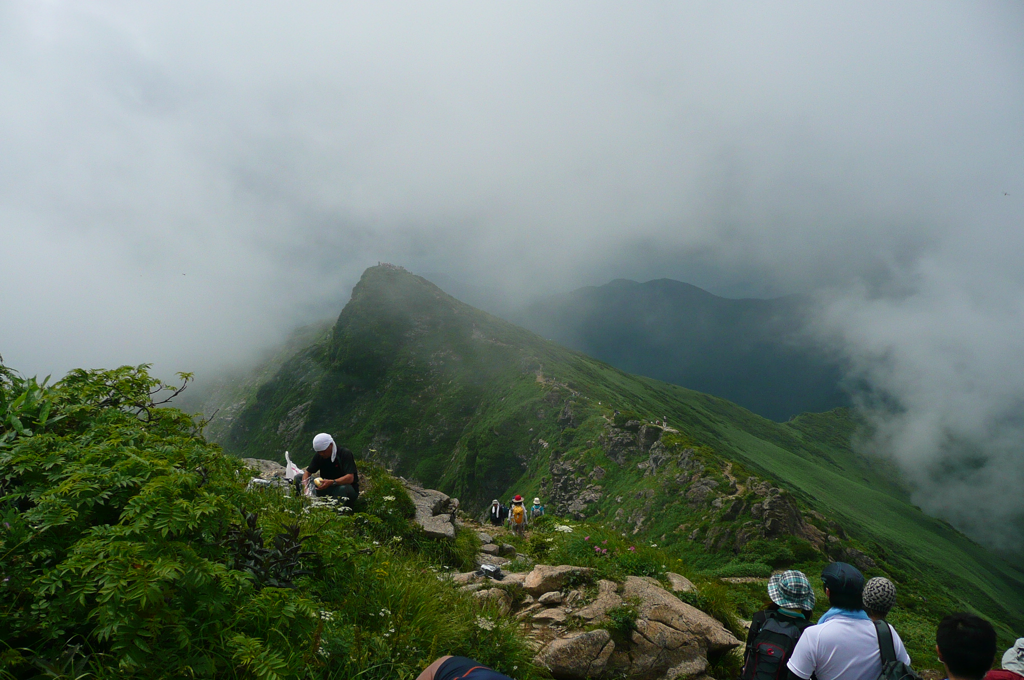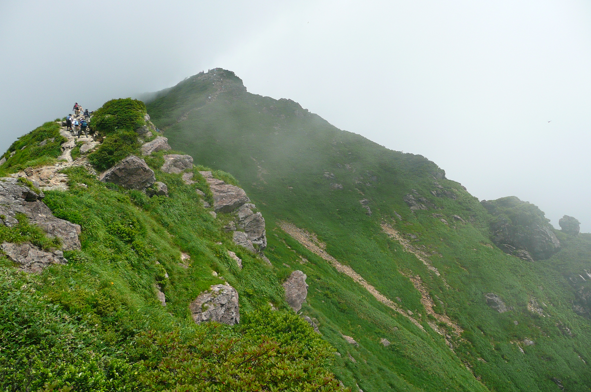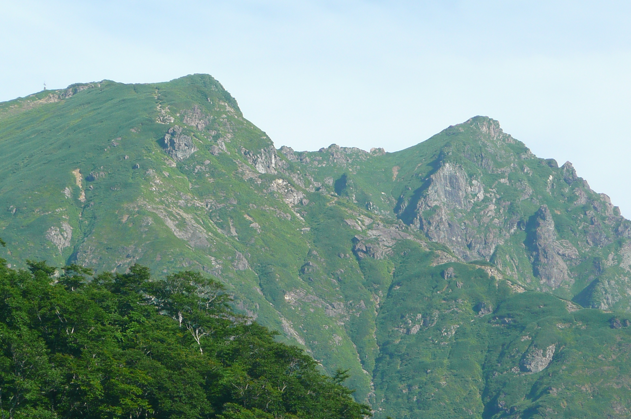 | 内容 | 朝起きると、快晴だった。蒸し暑く、寝苦しいのちょっと手前くらいの夜とは思えないくらい、カラッとしていた。 二日酔いのレベル4(10段階)くらいの状態で、朝食を済ませ、準備を整えてバスに乗り込む。6:30出発。 ロープウエイが7時始発なので、乗り場で少し待つ事になった。 それにしても天気がいい。良すぎて暑そうだった。 ロープウエイの下り場(上がった先)が21度だったので、朝の7時前だというのに、やはり登山には気温が高すぎる。 夏山こそ、高い山を選ぶべきだと私は思っているのだけど、2000mを超えてくるとグッと涼しくなってくる。3000mまで上がれば、朝夕は寒くてフリースやジャンバーを着込まないと居られなくなるし、日中は上り下りしている限り、いつもの半袖短パンがちょうど良い。 ロープウエイに乗り込むと、途中からものすごい斜面を登って行き、この辺りにも登山道があるらしいのだけど、つくづく行かなくて良かったと思った。スタートからこんな急斜面を歩いたら、ものすごい暑さだと思う。(しかし、自分も軟弱になったのか、根性が無くなったのか、情熱の炎が弱火になったのか・・・いままでこんな事は考えたことが無かった) ロープウエイを下り、7:30より登山開始。谷川岳トマの耳〜オキの耳(主峰)〜時間が許せば一ノ倉岳までをピストンしようという行程。 最初は緩やかな、林の中を登り始めた。斜めの木道が歩きづらいし、木道が終わり次の木道に入る時、とても高い位置にあるので、それも「よいしょ」と、歩きづらかった。 しばらく行くと小屋が見えてきた。ここを出発した頃から、蒲原さん(かんちゃん)、遊佐さん、毛利優ちゃん、らが先頭に立った。 自分が先頭を行っていたのだけど、須藤・浩哉いつもの二日酔いコンビはどうでも良くなってきて、「休み休みゆっくりいくべー」が、合言葉であり、励まし合いの言葉となっていった。 アッという間にに森林限界を過ぎ、太陽がジリジリとしてきた。登山道も次第に急になってきて、喉は渇くし、汗は止まらないし、足は前に出ないしと、ダメダメコンビはすぐに休憩をとり、休めばいつまでも出発しないという繰り返しだった。(そーゆー意味では非常に息が合っていた) それでも頂上はグングン近付いてきて、「天神ザンゲ岩」なる場所に到着すると、なんだか大きなダブルベッドか、大きなソファーのような岩が、形は両手をお椀の様にしたような状態というか、大きな貝殻の様な感じで私達を待っており、どちらからともなく「大休止」の言葉が出てきて、二人で寝転がって休んだ。 当然、眠ってしまい、20分くらい過ぎた頃だろうか、佐々木夫妻が到着していて、奥さまに笑われてしまった。 だって、気温、日差し、疲れ具合、絶妙のタイミングにベッドがあれば、寝ない方がおかしいと思うので、みんなの方がおかしいから、これでいいのだ。d(^^)b 登る途中には遠くに至仏山、燧ケ岳、近くに武尊山(ほたかさん)、その奥に皇海山(すかいさん)、男体山、日光白根山が見え隠れしていた。武尊、皇海、男体山は登ったことが無いのだけど、見るからに男体山は大変そうだった。(南会津の山々を上っていると、案外近くに見えるお馴染みの山だけど、なだらかそうな斜面をどの角度からも見たことが無い) 去年の八ヶ岳の小屋まで激走して登った二人組とは思えないような、トボトボヨタヨタゆっくり歩く2人は、それでも1歩1歩進み、頂上直下「肩の小屋」まで到着。 そこからさらに登り、「トマの耳」1963mに到着。なんと、3時間以上もかかってしまった。 相変わらず頂上は混んでいて、順番を待って佐々木さんに写真を撮ってもらい、少し下りてその先の「オキの耳」を目指した。稜線を歩き、右側はさすがに切り立っていて、スリリングだけど、登山道の幅が結構あるので全く問題ない。 「オキの耳」に上る手前で遠くから私を呼ぶ若い女性の声が聞こえ、こんな所にまでファンが追いかけてきたのか、それとも意識が遠のき、先に岩場で遭難した女性達の叫び声がコダマしているのか、などと思っていたら、前方の岩場で手を振って私の名前を呼ぶ若い女性二人がおり、「よくもこんな山の中にまでファンが追いかけてくるものだなー」と思っていたら、毛利優子ちゃんと、遊佐さんだった。(それは手を振る訳で・・・) かんちゃん、TONTONママ、優子ちゃん、遊佐さんとすれ違いで聞いてみると、「時間が無く、一ノ倉岳までは全員行けなかった。富士浅間神社奥の院でお参りをして戻ってきた」 という事で、昼寝したり、休んでばかりいた私達ダメダメコンビと、たいして変わらないじゃないかと思い、そんなに急いでもそれほど変りはないものだと、自分達を慰めながら、「オキの耳」頂上へと、ちゃんとたどり着くのでありました。 こちらも混んでいて、少しガスがかかったり、晴れたりの繰り返しで、とりあえず写真を撮り、来た道をまたトボトボと戻る、従走とは違い帰り道が少しさみしい、