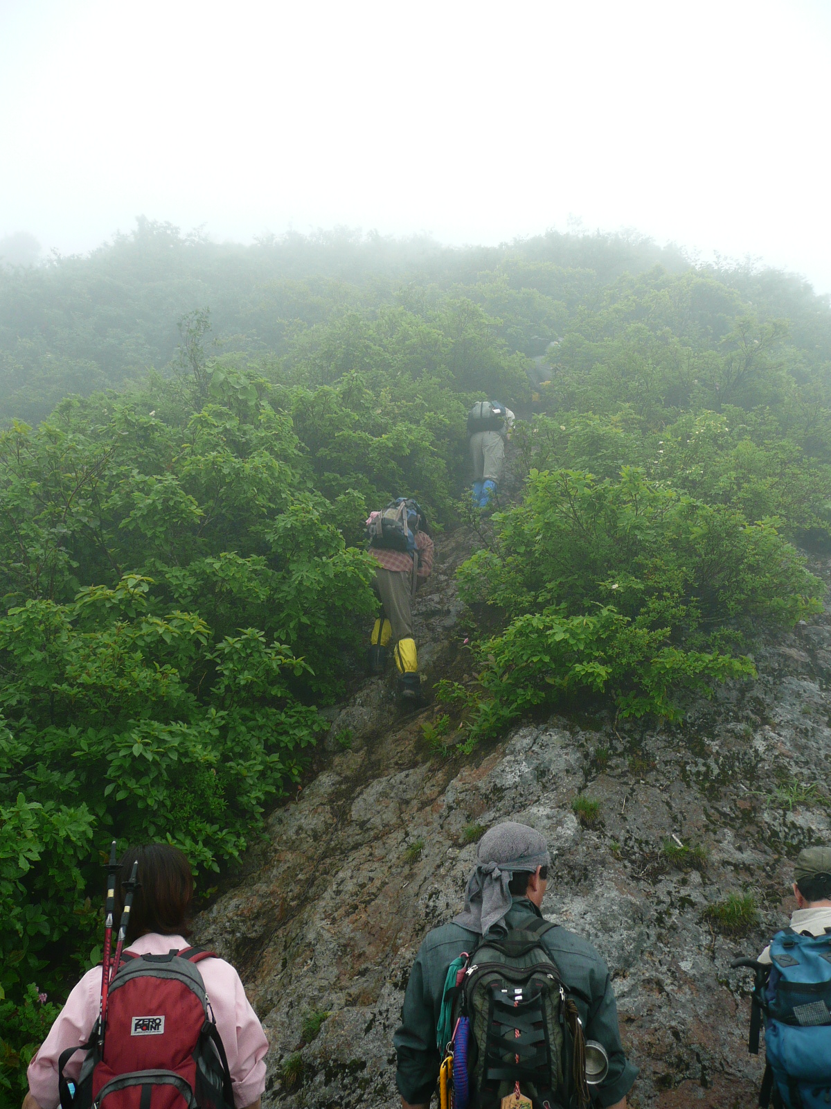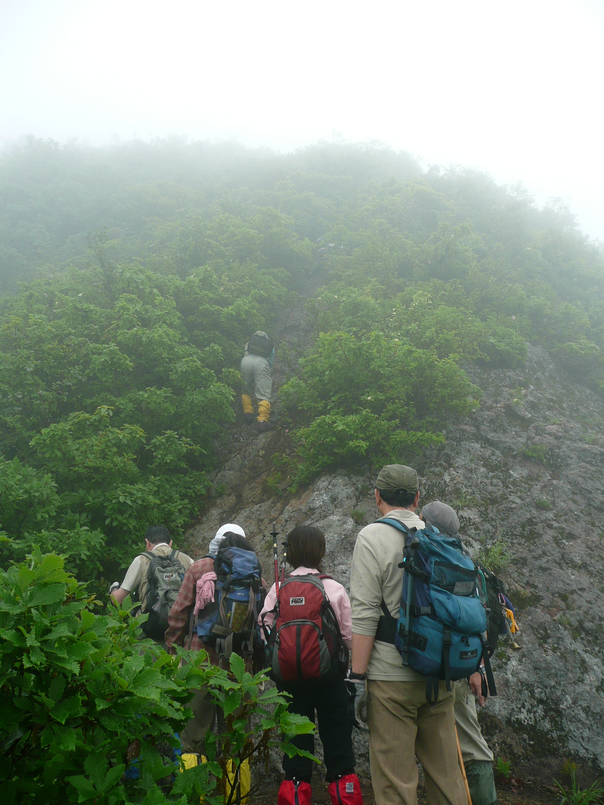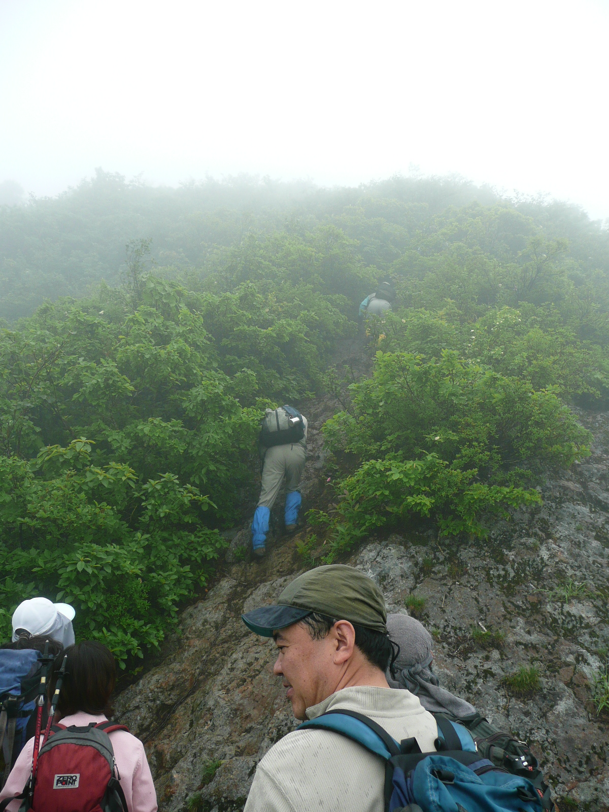 | 内容 | 稜線を進むと「熊打ち場」という、なんだか「よし!!これから勝負だ!!」なんて、言いたくなるような地名の場所に出た。見ると、目の前に鎖場が雲の中へ向かって続いている。先がどうなっているのか、どのくらいの高さなのか、全く見えない。 一人一人登るところを写真に収めていたのだけれど、松崎さんだけあっという間に登ってしまい、見えなくなったので写真に撮ることが出来なかった。(ホント、特殊な訓練を受けてきた方にはかないません) 結構登って再び歩き出すと、小屋に到着。山開きのせいか、水場(小屋から200m下)から汲んできた水を頂いたら、冷たくてものすごく美味しかった。 一息ついて、頂上を目指す。森林が途切れ、草木が低くなるとすぐに頂上だった。「本名御神楽岳頂上」なぜか、御影石の触るとぐらぐらする今にも倒れそうな目印だった。御神楽で御影石、シャレか?意味無いのか? |
