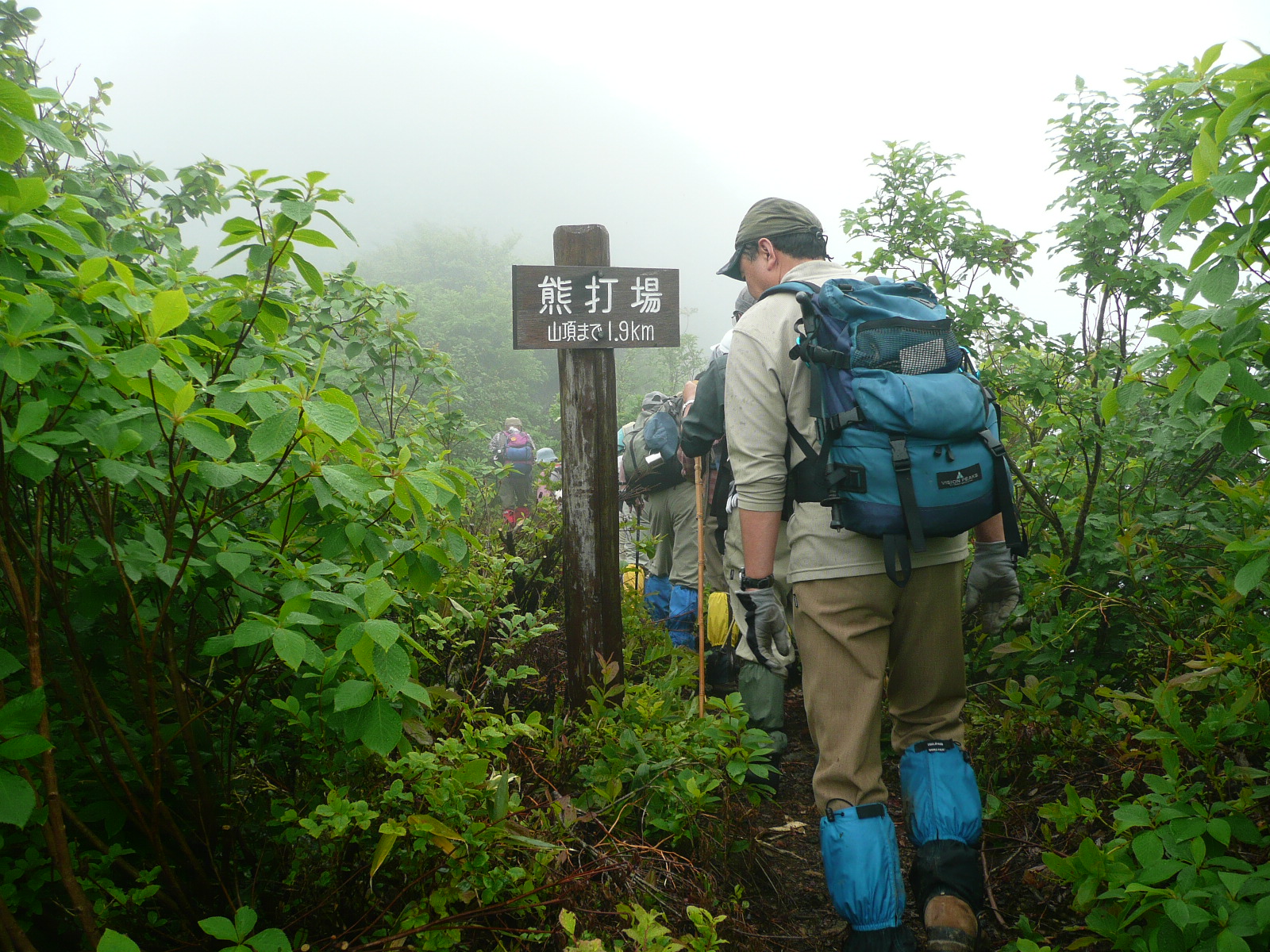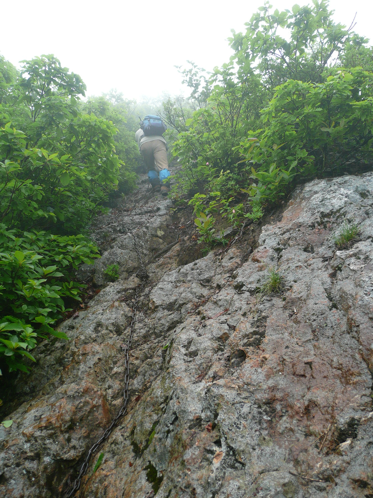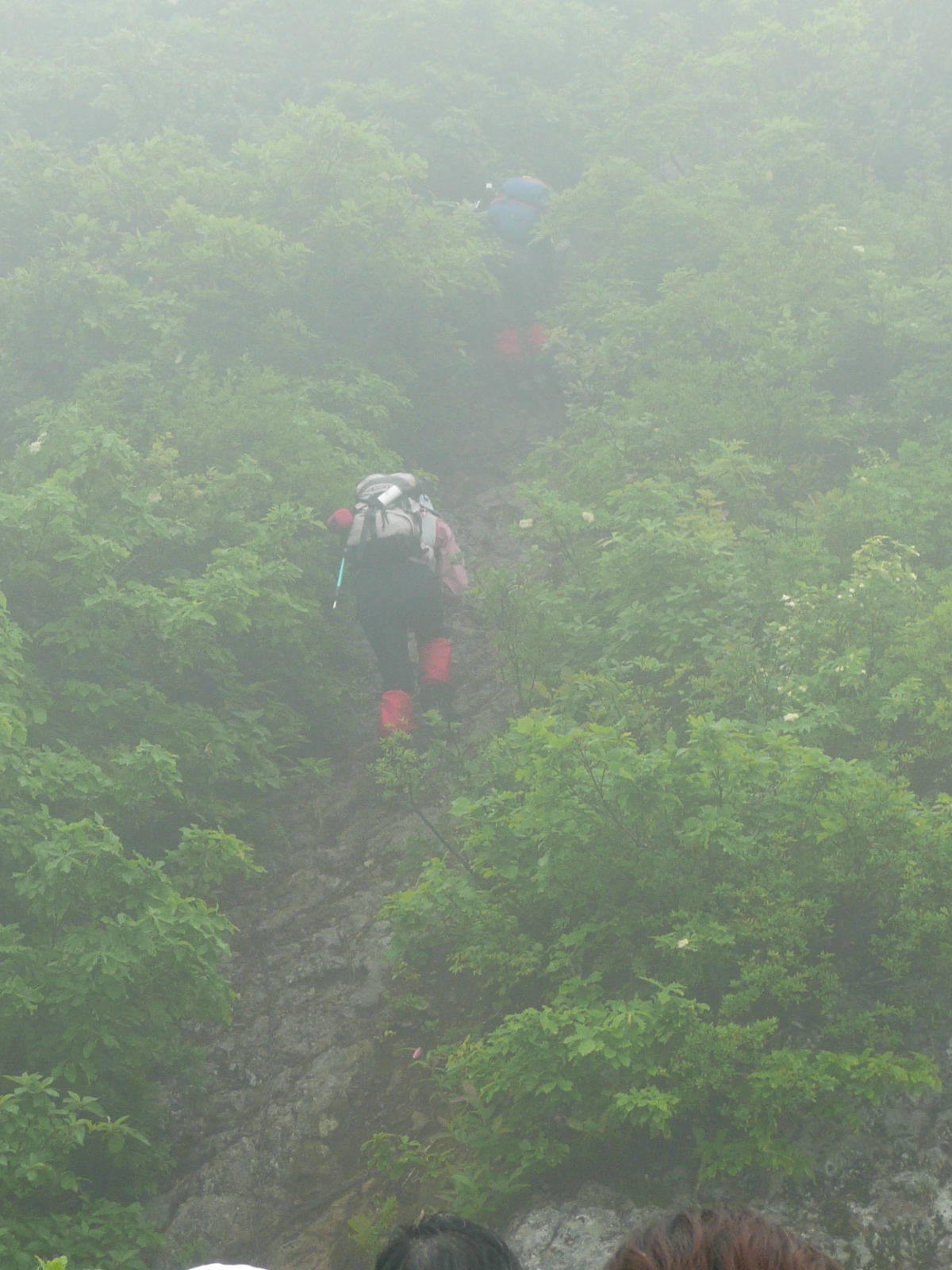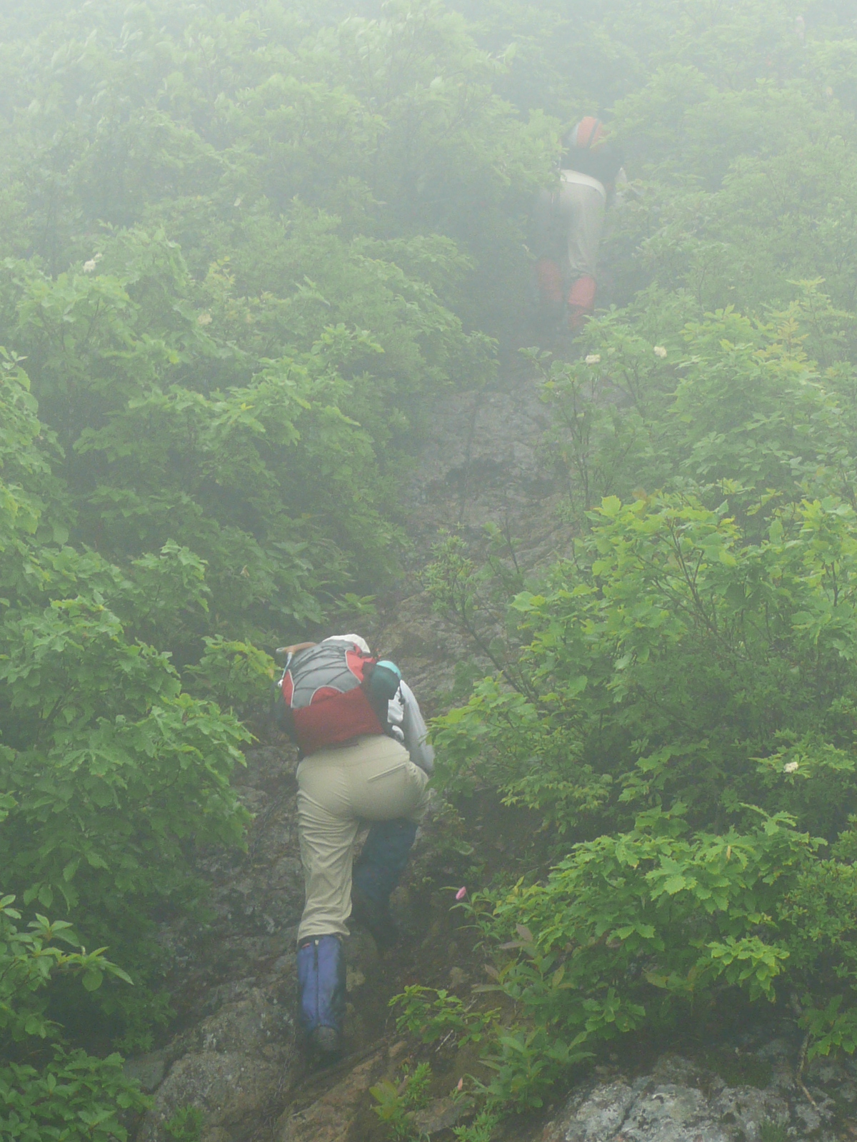 | 内容 | 稜線を進むと「熊打ち場」という、なんだか「よし!!これから勝負だ!!」なんて、言いたくなるような地名の場所に出た。見ると、目の前に鎖場が雲の中へ向かって続いている。先がどうなっているのか、どのくらいの高さなのか、全く見えない。 一人一人登るところを写真に収めていたのだけれど、松崎さんだけあっという間に登ってしまい、見えなくなったので写真に撮ることが出来なかった。(ホント、特殊な訓練を受けてきた方にはかないません) 結構登って再び歩き出すと、小屋に到着。山開きのせいか、水場(小屋から200m下)から汲んできた水を頂いたら、冷たくてものすごく美味しかった。 一息ついて、頂上を目指す。森林が途切れ、草木が低くなるとすぐに頂上だった。「本名御神楽岳頂上」なぜか、御影石の触るとぐらぐらする今にも倒れそうな目印だった。御神楽で御影石、シャレか?意味無いのか? |